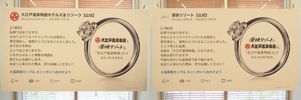 会見には「大江戸温泉物語ホテルズ&リゾーツ」の橋本啓太社長と「湯快リゾート」の西谷浩司社長が登壇し、ブランド統合の経緯や今後の展望について説明がありました。