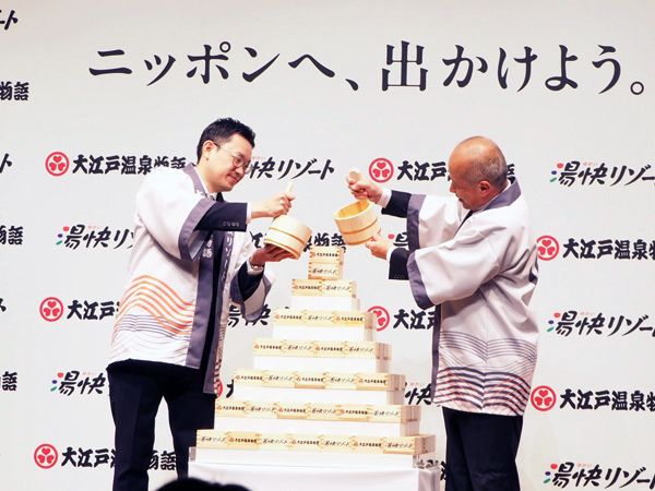発表会のラストには、結婚式の「水合わせの儀」にちなんだ「お湯合わせの儀」が行われました。西谷社長と橋本社長は「これからもみなさんに、より気軽で楽しい温泉体験をお届けしていく」と決意を表明。両社の今後の繁栄を願う象徴的なセレモニーとなりました。