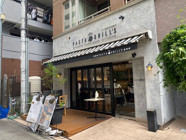 <大阪発>天満駅から南東に出て3分ほどの場所にある「THE PASTA & GRILL'S(ザ パスタアンドグリルズ)」。モダンな外装で、テラス席はペット可です。