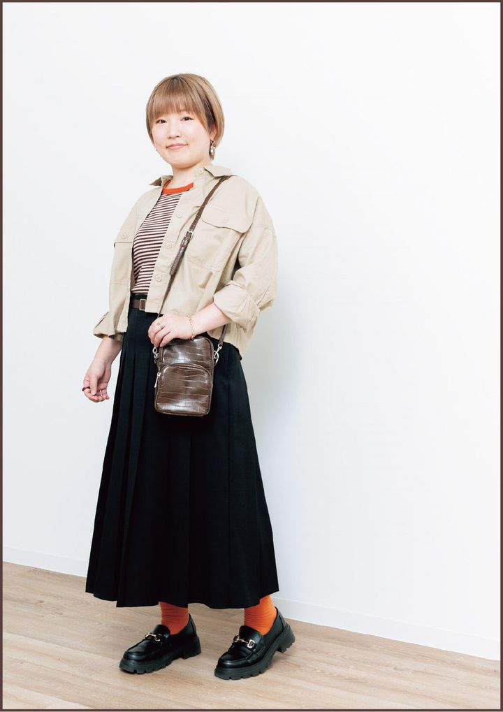 トップスやバッグは秋らしい茶系をセレクト。アウターがゆったりめな分、トップスはタイトにしてみました♥ 靴下と首元のオレンジが差し色です!
