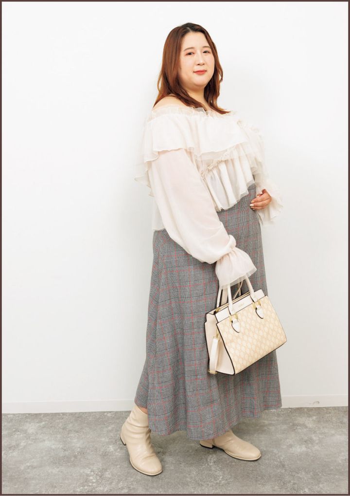 オフショルのチュールトップスとグレンチェックのスカートでガーリーなコーデに。スカートがハイウエストなので脚長効果もあってお気に入り。