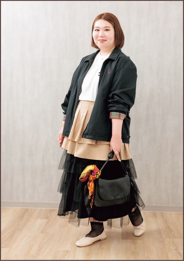 小川みちこちゃんがプロデュースした異素材使いのスカートを主役に、白TでスポーツMIXに仕上げました。バッグにつけたスカーフも秋を意識!