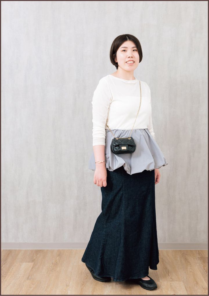 長袖トップスとキルティングのバッグで秋らしさをプラス。ペプラムベルトでトレンド感を出しつつ、腰周りをカバーしたのがポイントです!