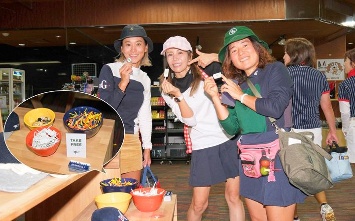 「BEAMS GOLF」のロゴが入ったオリジナルのティやコインマーカーを無料配布。スタートが終わる頃にはほとんどのアイテムが空になっていました