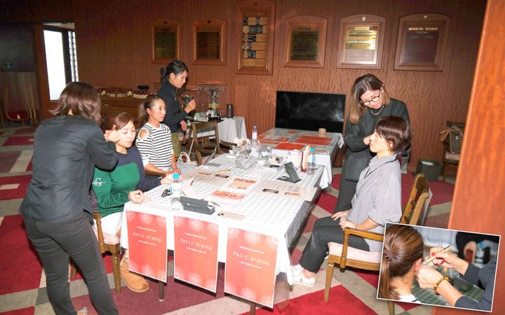 ホールアウトしても、まだイベントは終わりではありません。クラブハウス2階のレストランには、サラダバイキングやデザートビュッフェが用意された他、耳つぼサロン「Petit Blanca(プチブランカ)」による耳つぼ体験コーナーや『DELIFAS!』のブースが設置されました。プロの施術による耳つぼ体験には多くの女性ゴルファーが足を運び、ラウンドで疲れた体を癒していました。