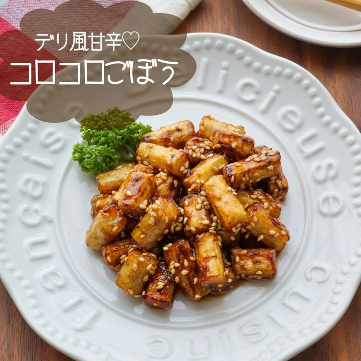 コロコロとしたかわいらしい見た目のデリ風ごぼう。ぶつ切りにすることで、ごぼうのシャキシャキ食感もしっかりと楽しめますよ。
