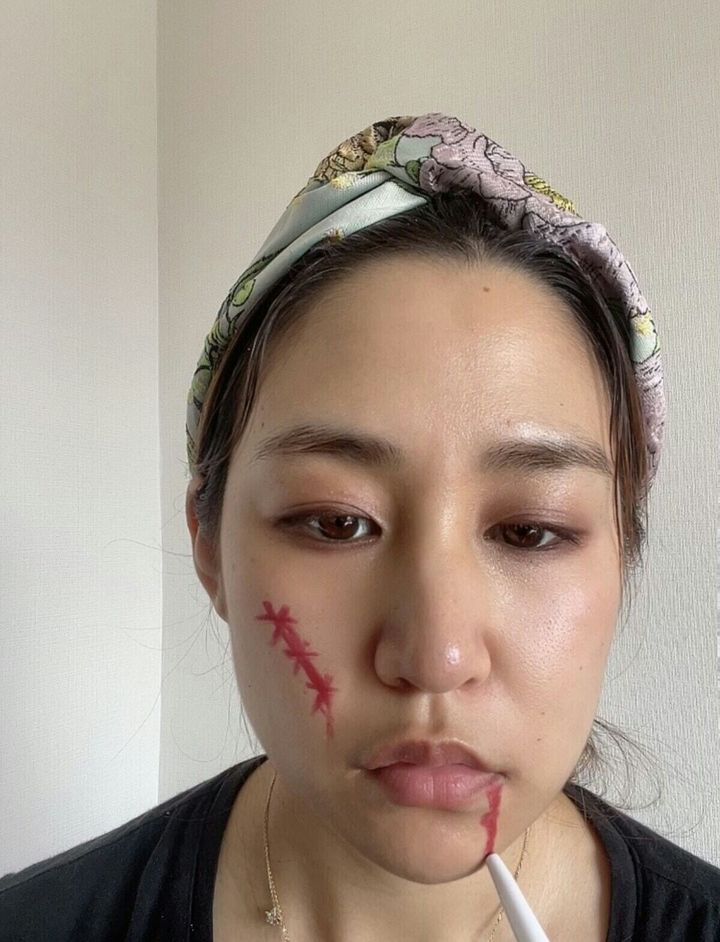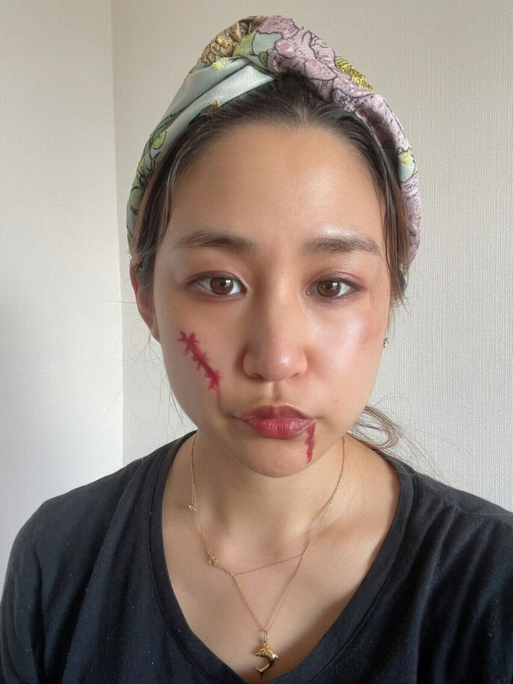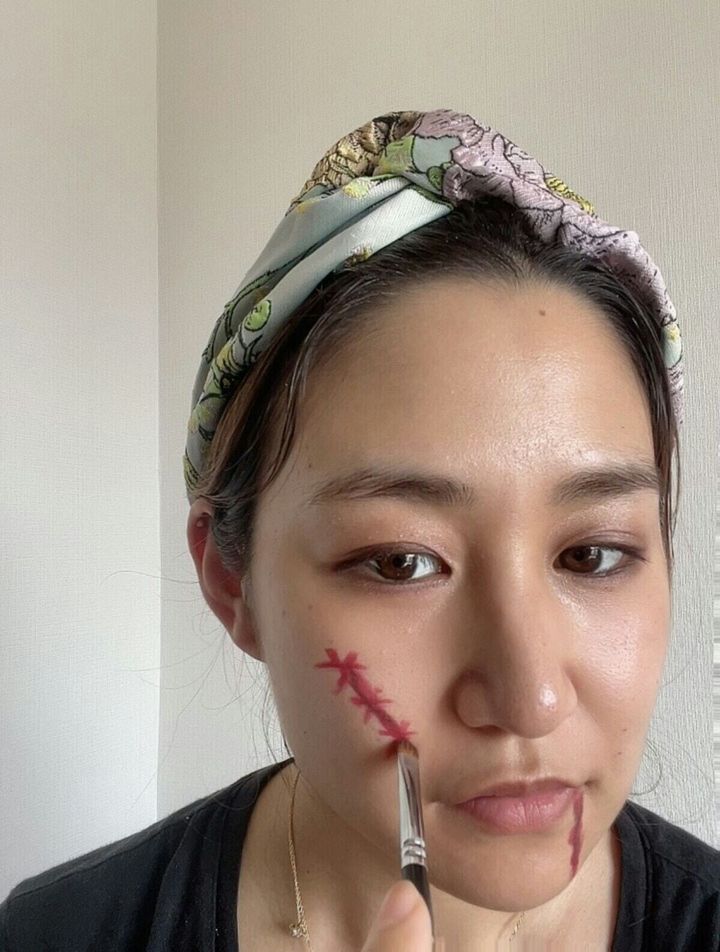 血糊で描くと実物っぽく見えますが、今回は家にあるものでチャレンジ。これでも十分傷っぽさが出ますね。