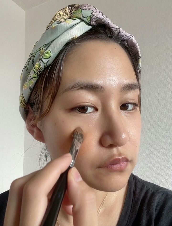 大きいブラシで頬などにも暗いブラウンをなじませたら完成。
