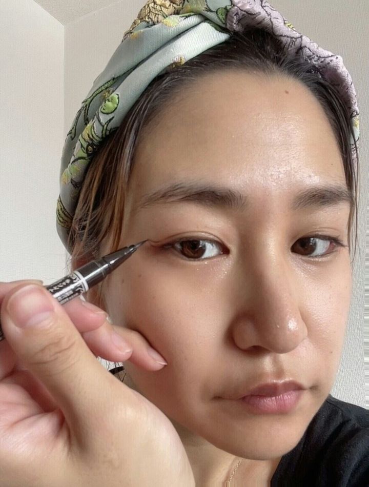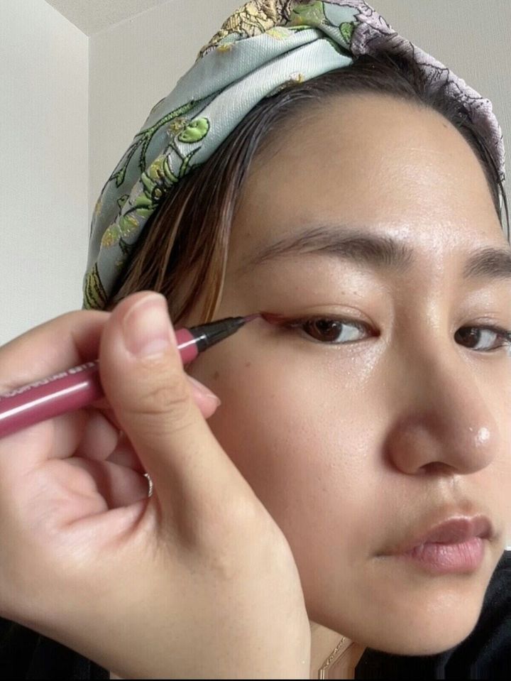 目尻に黒やダークブラウンのアイライナーで三角形を描きます。二重の方は二重幅の延長から描き始めます。