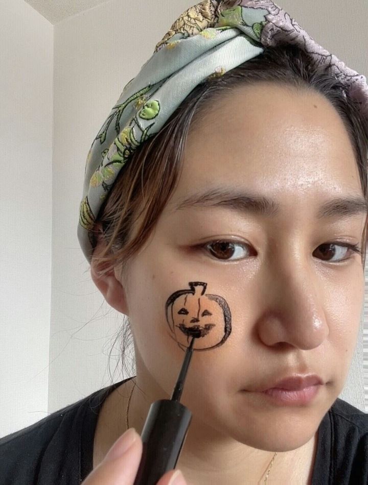オレンジの周りを黒いアイライナーで縁取りをして、中に三角の目と鼻を描きます。口は難しいようでしたら半円でもOK。最後に細く縦の線を描きましょう。