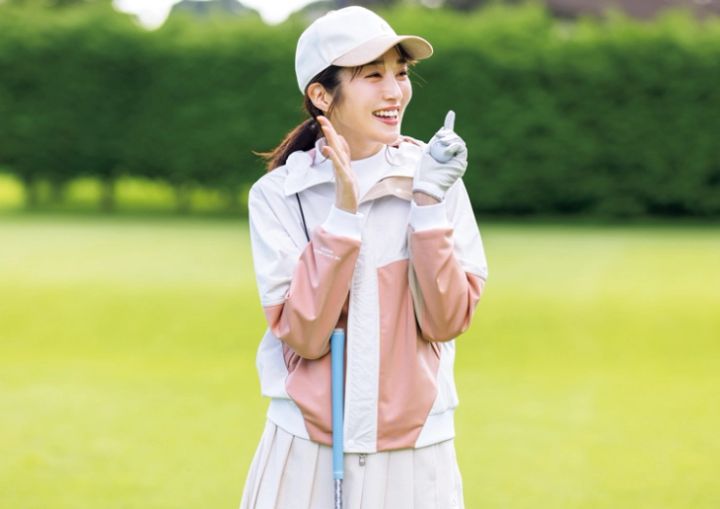【高梨さん】ブルゾン¥41,800/TFW49 モックネックシャツ¥11,880/チャンピオン(ヘインズブランズ ジャパン) スカート¥14,300、ソックス¥1,430/ともにアディダスゴルフ(アディダス ジャパン) キャップ¥5,940/ビバハート(グリップインターナショナル) 靴¥24,200/コール ハーン(コール ハーン ジャパン) グローブ[片手]¥1,980/テーラーメイド(テーラーメイド ゴルフ)