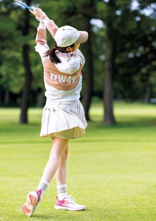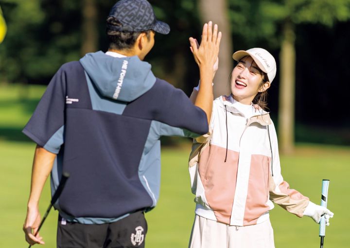撮影/前田晃 スタイリング/高橋裕美 ヘアメイク/YUMBOU(ilumini.) モデル/高梨臨、照屋和輝 クラブ協力/テーラーメイド(テーラーメイド ゴルフ) 文/浜田麻衣 ※andGIRL2024年秋号より