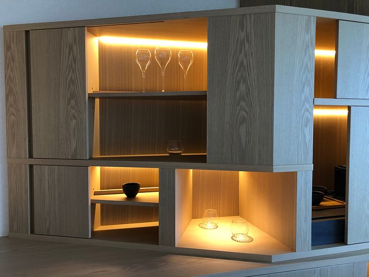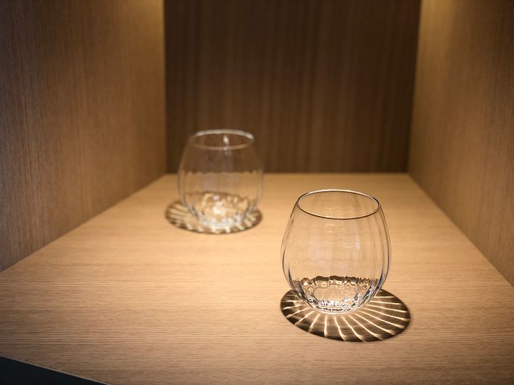 グラスなどが美しくライトアップされて、まるで芸術作品のよう。もちろん使用可能です。レストランからワインをオーダーしてお部屋で楽しんでみては?