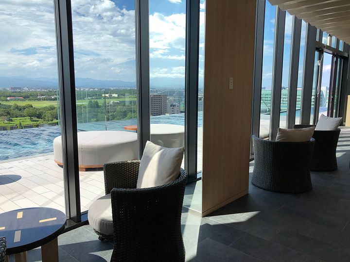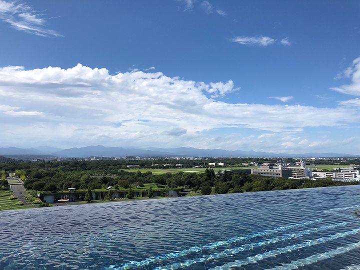 11階のインフィニティプールは、水面と緑豊かな景色が溶け込み、そこには無限に広がる美しい世界が。晴れて空気の澄んだ日には富士山が見られるのだとか。プカプカとプールに浮かんでいると、まるで天空にいるかのような気持ちになります。