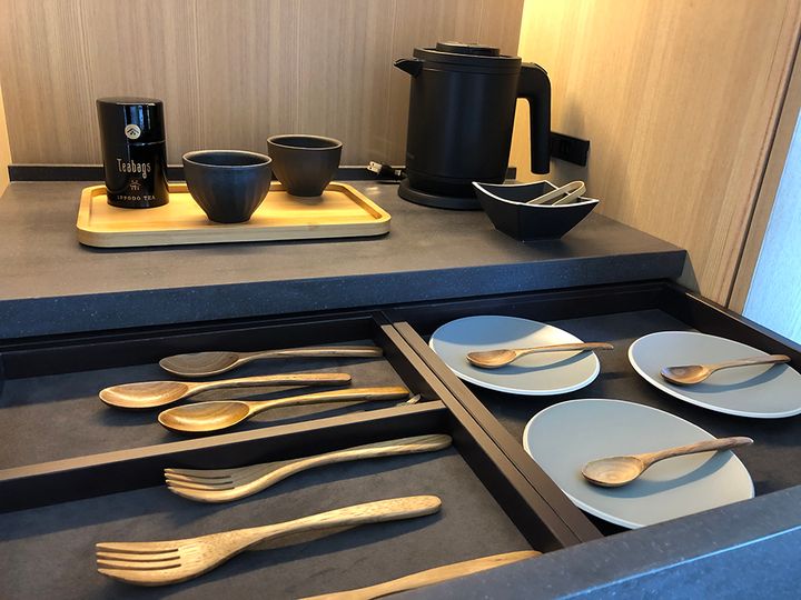 客室には食器やカトラリーを常備。近くのデリやレストランでテイクアウトしてもOKですが、ホテル内「ダイチノレストラン」では18~20時LOでドリンクや食事を客室まで届けてくれる「インルームダイニング」もあるので、こちらを利用して、部屋でゆっくり食事を楽しむのもおすすめです。