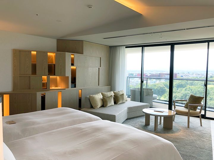 ベッドは客室中央に、バルコニーに向けて設置されています。昭和記念公園の豊かな自然をベッドに寝転びながら楽しめるなんて、とても贅沢!
