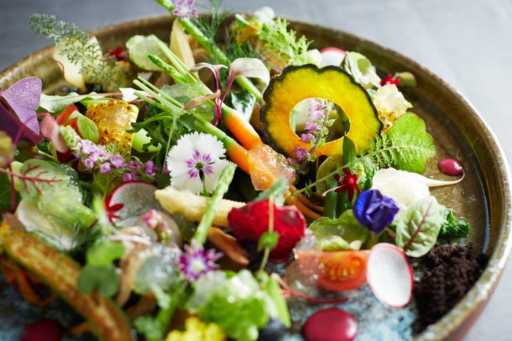 例えば、野菜のセラーから取り出した旬の野菜とエディブルフラワーなど全部で30種類以上を使ったシグニチャーの「大地のサラダ」は、彩りも見事でビタミンがいっぱいとれそう。
