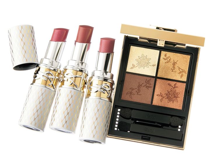 みずみずしく彩る人気リップが華やかな装いに。YSL ラブシャイン リップスティック 〈コレクター〉44P、201、209P 各¥6,380、繊細な花のエンボスを施した異なる3質感をセット。クチュール ミニ クラッチ〈 コレクター〉024¥10,890(すべてイヴ・サンローラン・ボーテ)