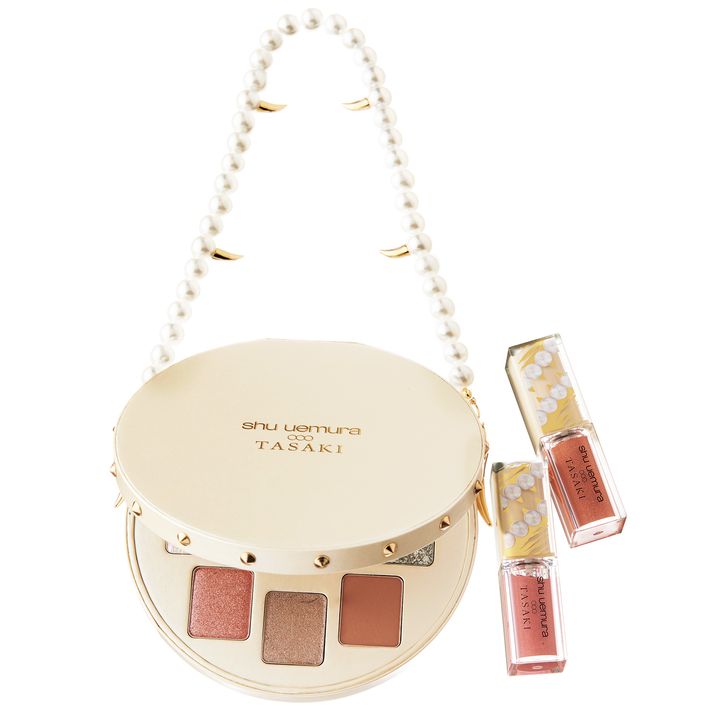 左から:TASAKIのアイコン「デインジャー」のゴールドファングが目を惹くパレット。真珠のように輝く9色をセット。パール レベル クラッチ アイシャドー パレット¥11,000、キヌルージュクリーム ラウンドカット ヌード、アイコニック ベージュ 各¥5,060(すべてシュウ ウエムラ)