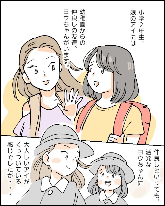 小学2年生の娘アイちゃんには、幼稚園から仲良しの友達ヨウちゃんがいました。仲良しといっても、活発な性格のヨウちゃんに、大人しいアイちゃんがくっついているような感じだったようです。