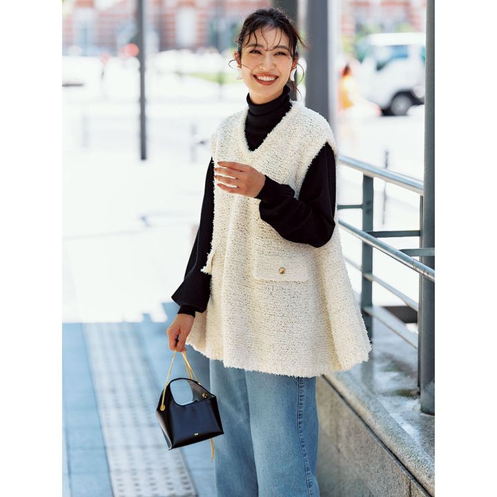 ジレ¥20,900(スリースクエア)タートルニット¥27,500(スローン/ザショップスローン新静岡セノバ店)パンツ¥27,500(アッパーハイツ/デミルクスビームス新宿)イヤリング¥2,100(アビステ)バッグ¥29,700(TOV/アンソロジー)