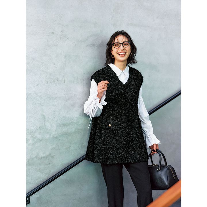 ジレ¥20,900(スリースクエア)ブラウス¥12,650(レイビームス/レイビームス新宿)パンツ¥26,400(Sov./フィルム)メガネ¥44,000(アイヴァン/アイヴァン東京ギャラリー)ピアス¥39,600(ミチウィルウェイ/フォーティーンショールーム)バッグ¥24,200(メゾンヴァンサン/フラッパーズ)
