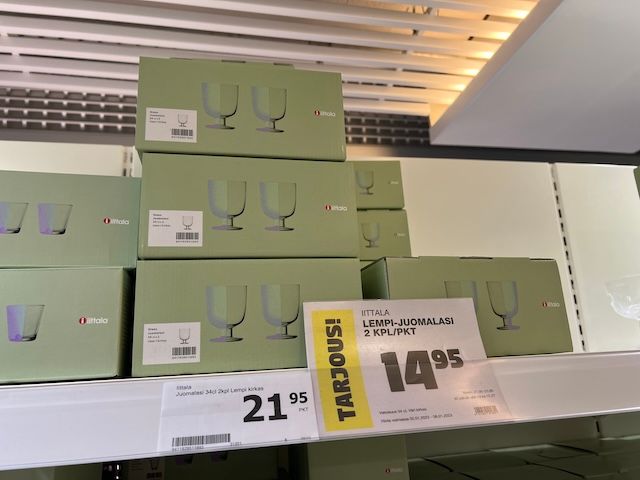 実は、イッタラのお店だけでなく、ヘルシンキ駅すぐのスーパーで安く販売されていることも! 食器コーナーに向かうと、イッタラ製品がずらり! こちらは朝早くからオープンしているので、先にお値段をチェックしてから、店舗でお値段比較するのがいいかもしれません。しかも嬉しいのが、スーパーですが免税も利用可能!筆者は、イッタラで人気のスタッキングできるグラスを定価21.95ユーロ(約3,610円)のところ14.95ユーロ(2,460円)と7ユーロ(約1,151円)もお買い得に!