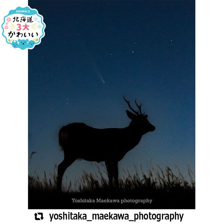 日没後の、エゾシカのシルエットの背景に、長い尾を引いた、「紫金山・アトラス彗星」が写っています。