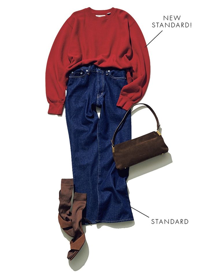 「ピンクよりも甘さがおさえられ、レディライクに仕上げてくれる赤。カジュアルな無地スウェットを赤にするだけで、いつものデニムスタイルにも特別感が。ネイビーのデニムやヒール靴など、やりすぎ感はないけど女性らしさのあるアイテムで、雰囲気を統一」(樋口さん)