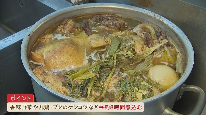 大きな寸胴の中には、香味野菜や丸鶏、豚のゲンコツなどが入っています。
