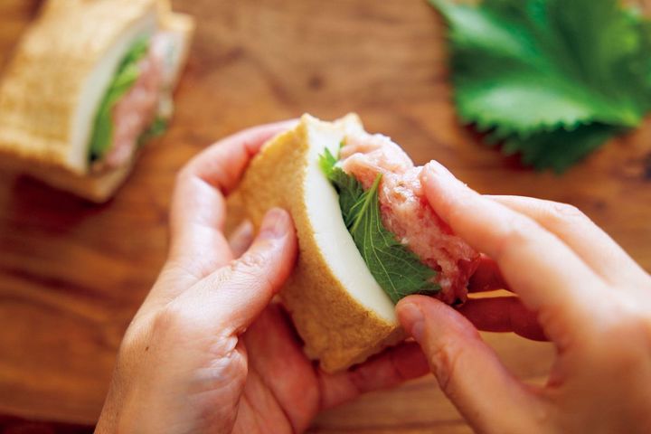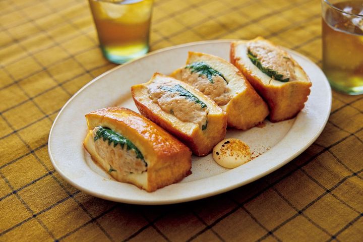 厚揚げは縦半分に切り、切り口の中心に切り込みを入れてポケット状にする。青じそに肉だねを等分にのせ、横半分に折りたたんで厚揚げの切り口に詰める。