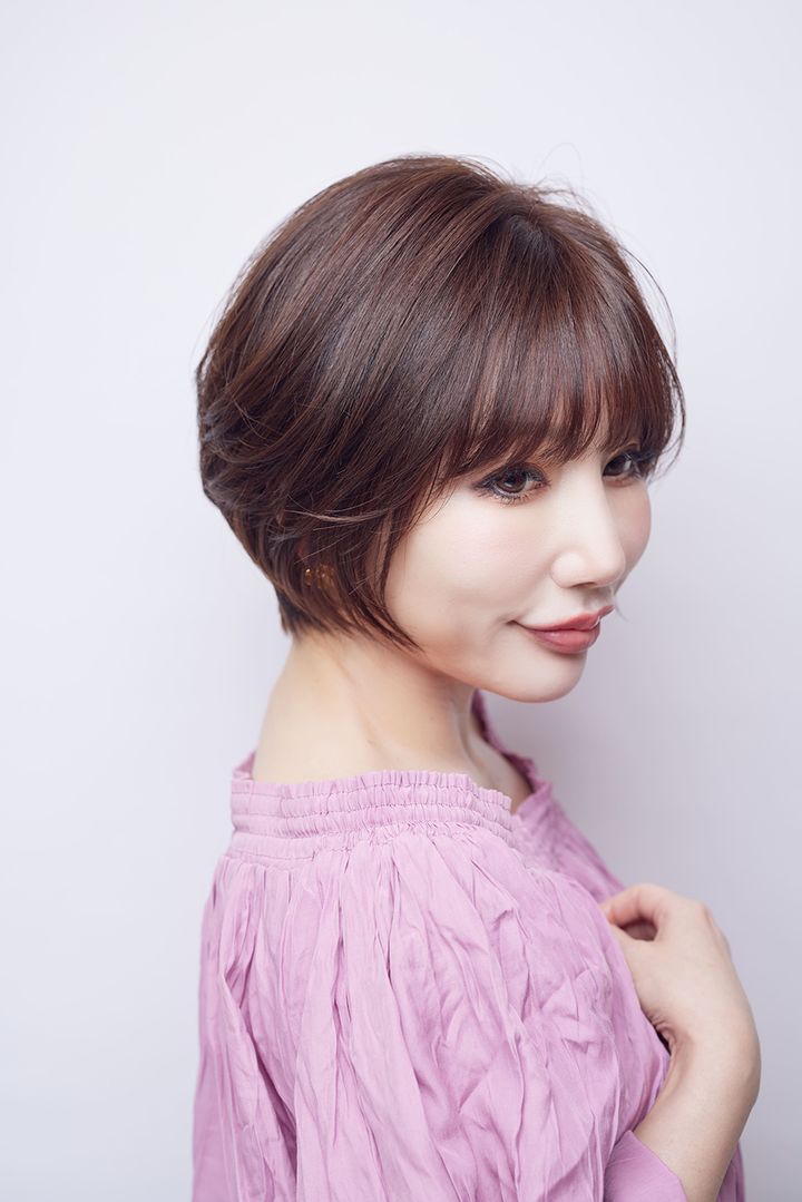 ショートを女性らしく楽しみたいという美スト世代にイチ押しの丸みショート。キレイな面を生かすことでツヤを出し、美髪効果を実感できます。さらに透け感とツヤが共存する秘訣はオリーブブラウンカラー。肌を明るく見せるのにもひと役。