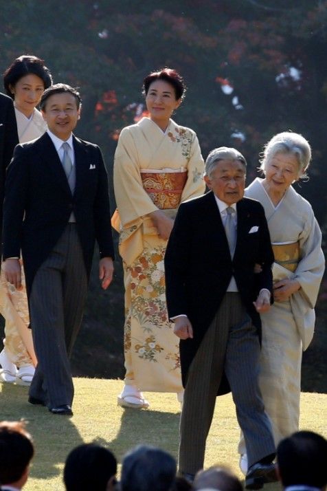 2012年、秋の園遊会にて。2003年の秋の園遊会でもお召しになっていた、菊と紅葉の柄がたっぷりと描かれた季節を感じさせる訪問着を、帯を替えてお召しに。ちなみに2003年は、2005年、2009年の秋の園遊会でもお召しになられている、金地に菱文様の袋帯をお選びになりました。(C)時事