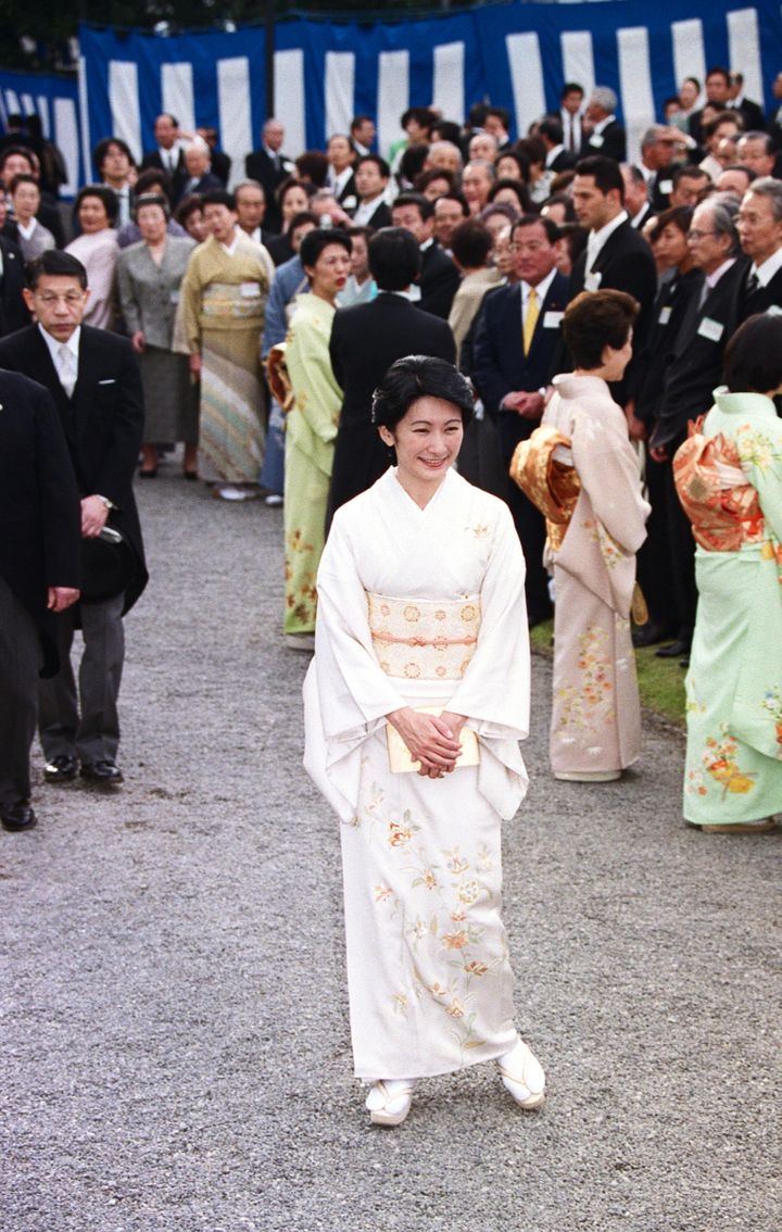 1999年、秋の園遊会にて。訪問着にはつづみの柄、帯には吉祥文様が。どちらも幸福や繁栄を意味する縁起の良い模様。ベージュっぽい地のお色に、淡い色合いの柄が愛らしく映えた、紀子さまの雰囲気にマッチした装いです。(C)時事