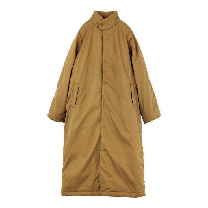 都会的な雰囲気と機能を両立させたコートを〈ナナミカ〉で発見。表地には高密度に織り上げた、防風性のあるコットンツイルを使用。100%リサイクル原料の中綿は軽くて暖かく、薄手ながらもしっかり防寒できる。ミニマルな比翼仕立てのフロントもいい。内側に施された、ウエストを絞るドローコードでアレンジしても。色違いでネイビー、ブラックもあり。