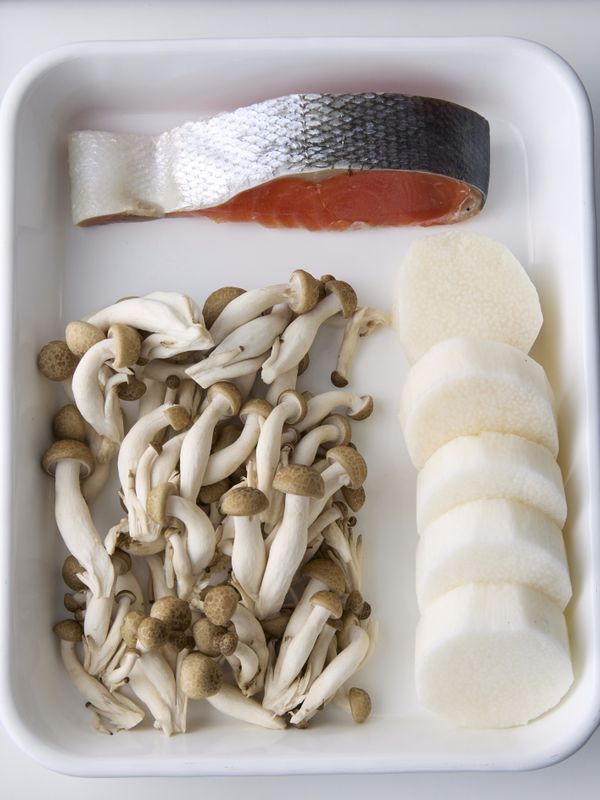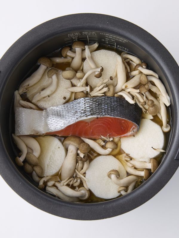 炊飯器の内がまに米を入れ、和風のたれを加えて2合の目盛りまで水を注ぎ、よく混ぜる。長いもを間隔をあけて並べ入れ、鮭をのせる。あいたところにしめじを加え、普通に炊く。炊き上がったら鮭の小骨を取り、鮭と長いもをくずしながら全体を混ぜる。