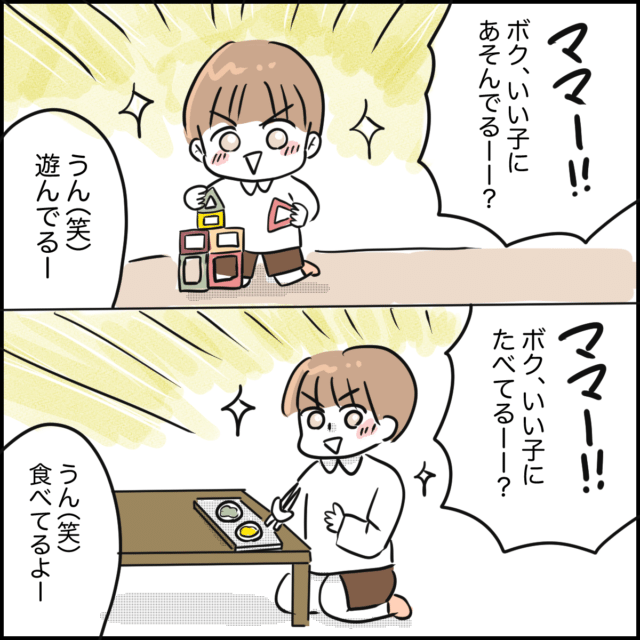 すると・・・。息子はこのやり取りの後から、おもちゃで遊んでいると「ママー!!ボク、いい子にあそんでるーー?」、ごはんを食べていると「ママー!!ボク、いい子にたべてるーー?」と確認してくるようになりました(笑)