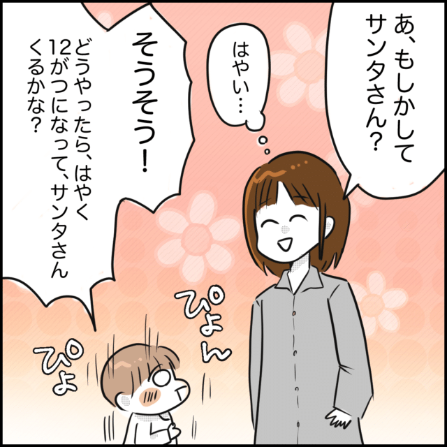 一瞬「え?」と思ったけれど、すぐにその質問の理由を察しました。早いなと思いつつも「あ、もしかしてサンタさん?」と聞くと、「そうそう!どうやったら、はやく12がつになって、サンタさんくるかな?」とぴょんぴょん飛び跳ねウキウキが溢れている息子。