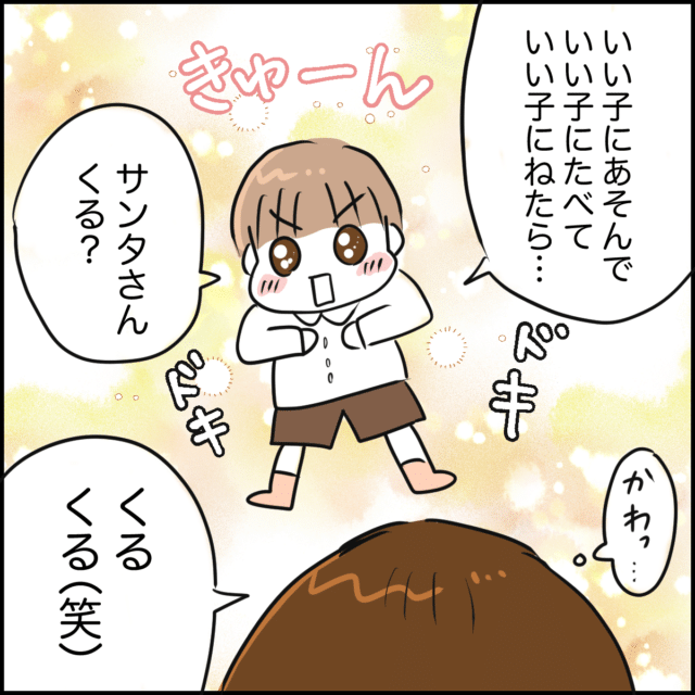 「いい子にあそんで、いい子にたべて、いい子にねたら・・・サンタさんくる?」目を輝かせてドキドキしながら確認してくるかわいい息子に「くるくる(笑)」と答えた私。