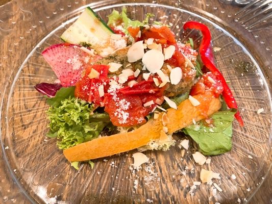 カツオのカツレツのサラダ!大きいお皿にたっぷり色とりどりのお野菜。中にカツオのカツレツが入っていました。これまた、初めての味!アーモンドスライス、粉チーズがかかっていて、いいアクセント。