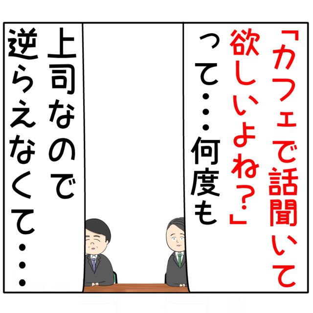 「『カフェで話聞いて欲しいよね?』って・・・何度も。上司なので逆らえなくて・・・」ふり子さんは作り話を続けます。
