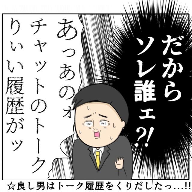 「だからソレ誰ェ?!」と心の中で叫びながら「あっあのォ、チャットのトークりぃい履歴がッ」と、保存しておいたふり子さんとのチャット履歴があると良し男さんが切り出しました。