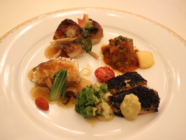 写真左上から半時計回りに:鶏肉の幽庵焼き、白身魚の道明寺揚げ オイスターソース、サーモンの黒パン粉焼き レムラードソース、仔羊のトマトスパイス煮込み