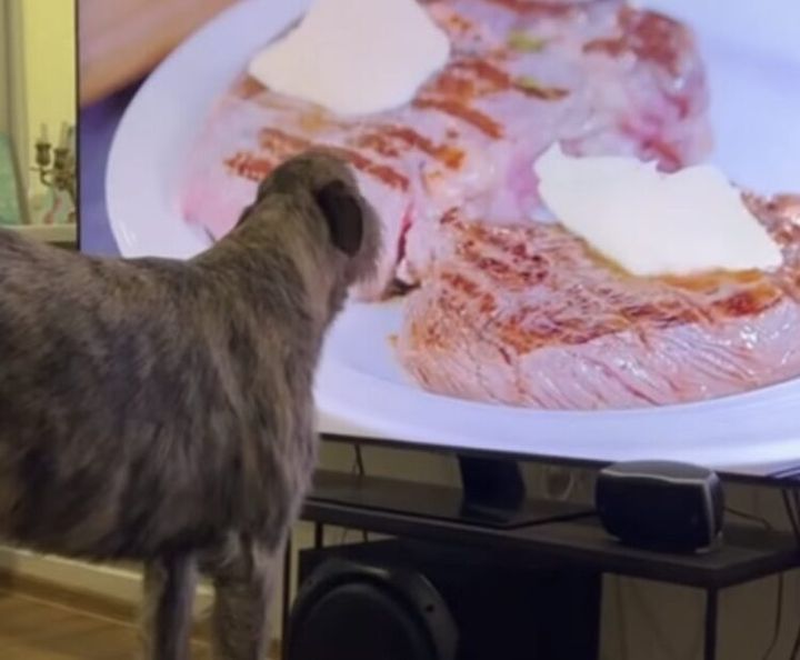 美味しそうなステーキの映像を見た犬さん「もしかしたら味がするかも」なんて期待をして