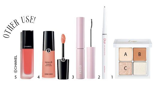 1.ミュートカラー×光感で印象的な目元に。ビーアイドル THE アイパレ R 06 ¥1,980(かならぼ) 2.ほんのり赤みのあるビターブラウン。ディーアップ エアクリームペンシル ピーチブラウン ¥1,320(ディー・アップ) 3.短いまつ毛も際立たせ、カールアップ。ファシオ まつパ級 フィルム マスカラ (極細) 01 ¥1,320〈編集部調べ〉(コーセー) 4.薄膜でフィットし、内からにじむように色づく。ルミナス シルク チーク ティント 50.5 ¥6,600(アルマーニ ビューティ) 5.しっとり唇に寄り添い、美しく彩る。ルミナスマットでマイルドなレッドウッド。ルージュ アリュール リクィッド ヴェルヴェット 206 ¥5,940(シャネル)