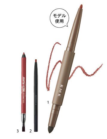 1.なめらかに描けフィット感も高い。スモーキーな赤。アイディファイニング ペンシル 07 ¥3,300(RMK Division) 2.芯の太さと柔らかさが絶妙。浮かない深みレッド。シュアネス アイライナーペンシル 15 ¥3,080(セルヴォーク) 3.くすみ感のあるメタリックレッドは、ぼかせばシャドウにも。カラーステイ マルチプレイヤー アイ ペンシル 406 ¥1,540(レブロン)