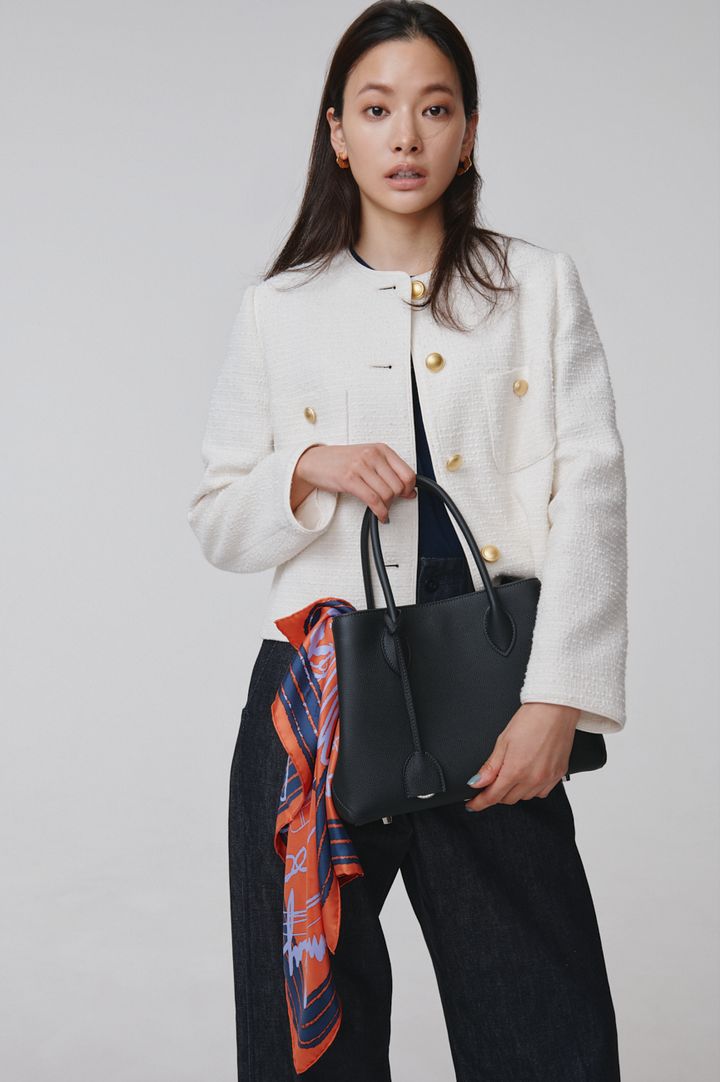 どんなコーディネートにもスッと馴染む柔らかなスクエアフォルムのトートバッグは、凛とした印象を強めてくれる、オフィカジ服のパワーアイテムです。もちろん甘さのあるツイードジャケットスタイルとも相性抜群。撥水加工が施されているので、水や汚れに強いのも嬉しいポイント。簡単なお手入れのみで長く美しい状態が保たれます。バッグ「ミア トートバッグ 30」¥209,000(ボナベンチュラ)ジャケット¥41,800(アルアバイル)カットソー¥12,100(シップス エニィ/シップス インフォメーションセンター)パンツ¥35,200(タンジェント)ピアス¥37,400(プラウ)スカーフ¥15,400(マニプリ)