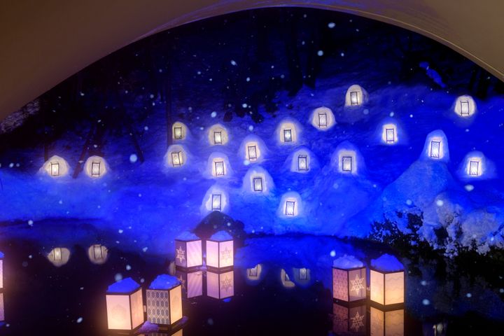 ロビーに面したパブリックスペース「津軽四季の水庭」は、季節の風景と津軽文化を楽しめる空間。四季折々さまざまな表情を見せ、宿泊者を楽しませていますが、このイベント期間には、津軽こぎん刺しで津軽七雪の模様を模した灯篭を浮かべ、幻想的な雰囲気を演出。津軽文化が彩る雪景色を満喫できます。