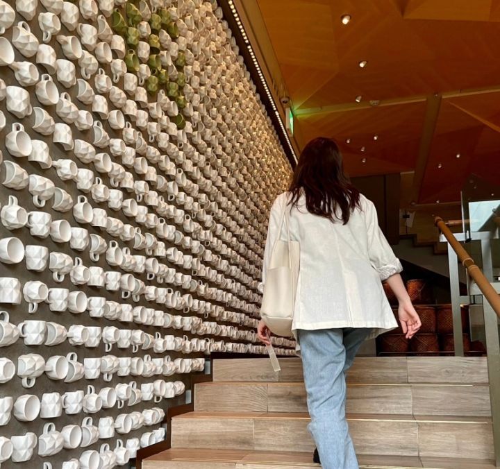 特に2階への階段で目を引くのは、ティーカップがあらゆる方向で取り付けられた「ティーカップウォール」。斬新なデザインで、美術館にある壁といわれても信じてしまいそうですね。