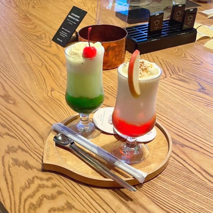 左の、見た目がメロンソーダのようなドリンクは実は、抹茶のクリームソーダなんです!